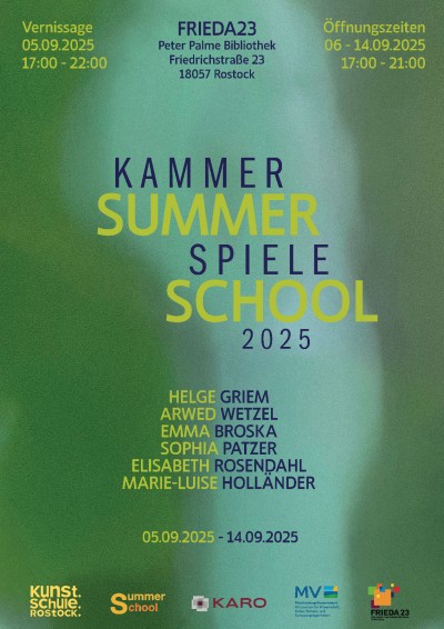 Seit 2015 öffnet die KARO AG mit der Summer School alle zwei Jahre für einen Monat die Ateliers und Werkstätten in der FRIEDA 23 für junge Nachwuchskünstler*innen. Die Ausschreibung für die Summer School erfolgt für die Genres Malerei, Grafik, Objektkunst, Installation, Fotografie, Illustration, Performance, Video- und Klangkunst, Architektur und Design. Die Begleitung durch Mentoren, interdisziplinäres Arbeiten und künstlerischer Austausch untereinander sind wesentlicher Bestandteil des Aufenthaltsstipendiums.